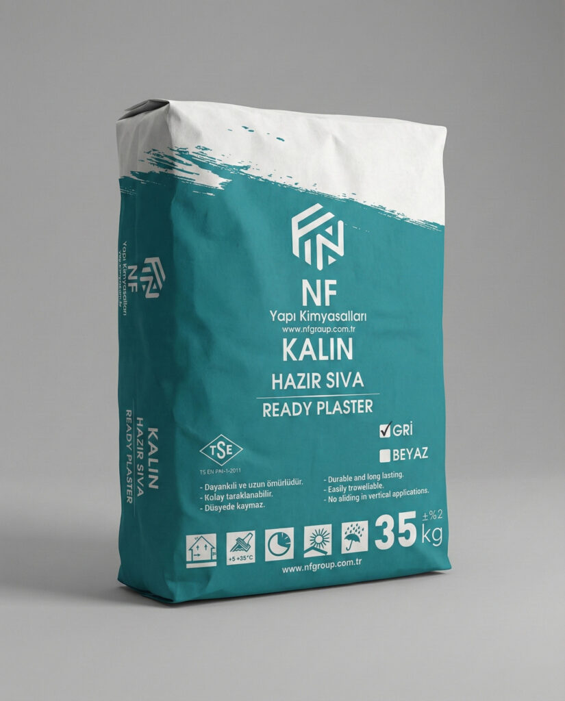 KARIŞIM : 35 kg’lık NF Kalın Hazır Sıva, yaklaşık 6 - 7 litre temiz su içerisine boşaltılmalı ve düşük devirli bir mikser veya betoniyer ile topak kalmayacak şekilde karıştırılmalıdır. Klasik "kara sıva" yöntemine göre hazırlanması çok daha pratiktir. Harç 5 dakika dinlendirildikten sonra tekrar karıştırılarak kullanıma hazır hale gelir.