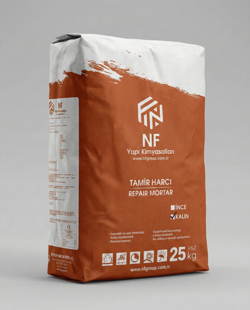KARIŞIM : 25 kg’lık NF Tamir Harcı, yaklaşık 5,5 - 6,5 litre temiz su içerisine yavaşça boşaltılmalı ve düşük devirli bir mikser yardımıyla topak kalmayacak şekilde karıştırılmalıdır. Hazırlanan harç, olgunlaşması için 5-10 dakika dinlendirilmeli ve uygulamaya başlamadan önce 1-2 dakika tekrar karıştırılmalıdır.